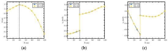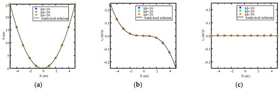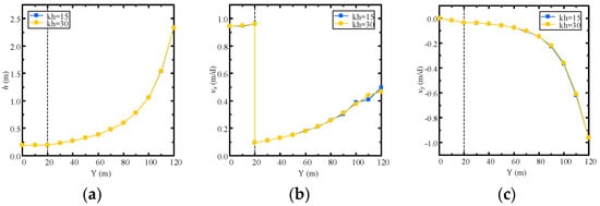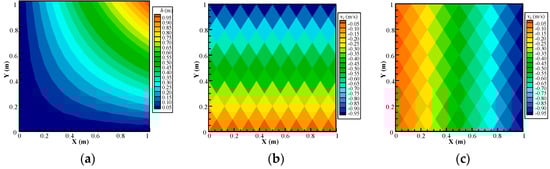 First, the problem is simulated by the proposed NMM model with a 60-layers mesh. As shown in Figure 11, the distributions of the hydraulic head and Darcy velocity are presented. From Figure 11a, an obvious difference in hydraulic head distribution caused by the change of boundary conditions can be observed compared to Figure 8a. Furthermore, the velocity field is also continuous in the problem domain (Figure 11b,c).