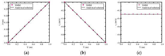 The comparison of solutions computed by the proposed NMM model using different mesh densities with an analytical solution along a profile located at x = 0.3 m: the (a) hydraulic head, (b) Darcy velocity in the x direction, and (c) Darcy velocity in the y direction.