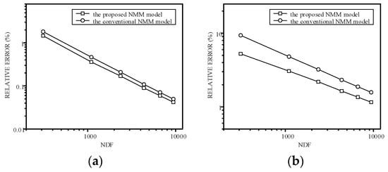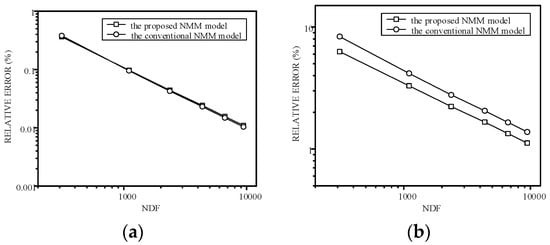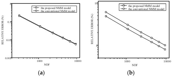 The comparison of convergence curves in the L2 norm by the proposed NMM model and the conventional NMM model: (a) the relative error of the hydraulic head and (b) the relative error of the Darcy velocity. (NDF: number of degrees of freedom).