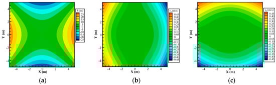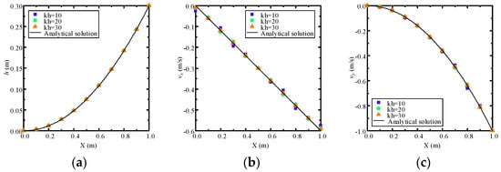 Figure 15a shows the distribution of hydraulic head, whereas Figure 15b,c show the distribution of the Darcy velocity and , respectively. The contour plots show that the distribution of numerical results is symmetric and continuous by the proposed model. In order to study the robustness of the cover system, numerical results along a profile at y = 0 m with 20, 40, and 60 layers of mesh are compared with the analytical solution. Figure 16a shows the comparison of the hydraulic head solution between the proposed NMM model and the analytical solution along a profile located at y = 0 m, indicating high precision for the hydraulic head solution. Furthermore, the Darcy velocity solution also shows good agreement with the analytical solution in this continuous-heterogeneous media in Figure 16b,c.