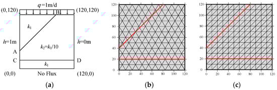 The last example is to verify the refraction law across material interfaces [], as shown in Figure 18a. Considering a rectangular domain of 120 × 120 m with material interfaces AB and CD, the permeability coefficients are and , respectively. The hydraulic heads are fixed with 1 m on the left side and 0 m on the right side, while the top boundary has a specified inflow flux of . The bottom of the model is impermeable. Due to the dual cover systems, the NMM mesh (Figure 18b) does not need to conform with the material interfaces, unlike the conventional FEM mesh (Figure 18c).