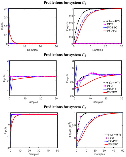 15)) for PC-PFC (blue-dotted line) is of dead-beat form and aggressive, whereas the input prediction (Equation (
