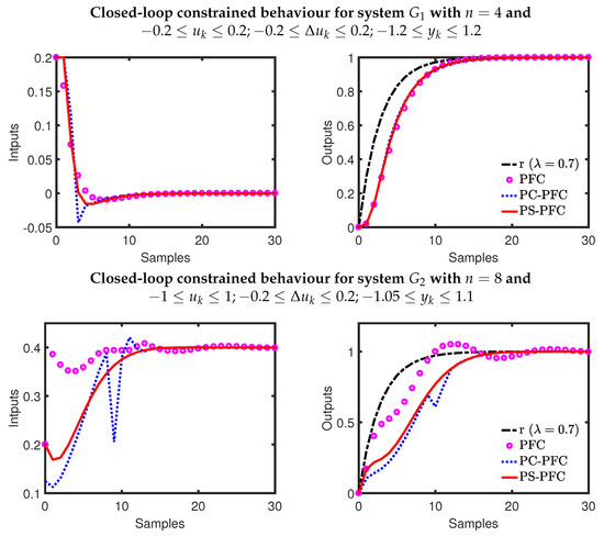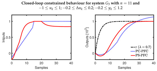 For the underdamped system , the output prediction from PFC includes a significant oscillation, which is undesirable and will also cause constraint handling to be conservative. The differences between PC-PFC and PS-PFC predictions are similar to those noted for , that is, PS-PFC has a much smoother and less aggressive input prediction, albeit slow, and output prediction, due to the choice of . Of course, this difference means that the constraint handling for PS-PFC will be far more preferable and less conservative, in general. Conversely, since PC-PFC cancelled out two of their oscillatory open-loop poles, a sudden spike or aggressive damping is expected in the output response.