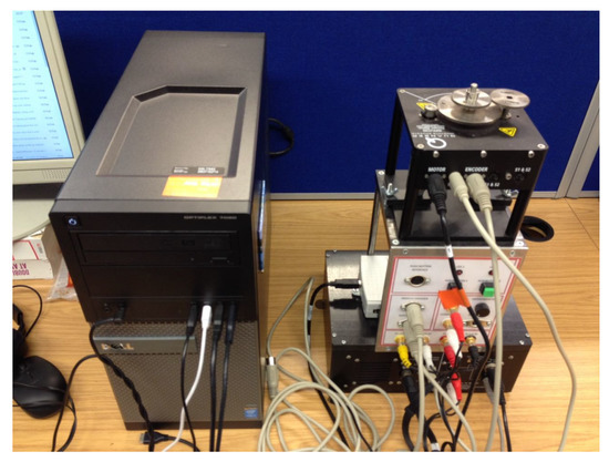 Figure 5). This device is powered by a Quanser VoltPAQ-X1 amplifier and operates by National Instrument ELVIS II+ (National Instruments, Austin, TX, USA) multifunctional data acquisition via USB connection. The control objective is to track the servo position