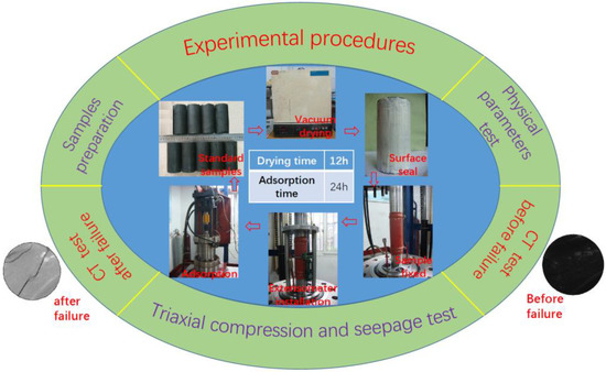 Figure 1 illustrates the designed cycle of experimental procedures for coupled research including the determined physical parameters, the multiscale structures by computed tomography (CT) before and after failure, and triaxial compression coupled with CH4 seepage. Triaxial servo-controlled seepage equipment for coupled thermos-fluid-solid of coal was adopted for the coupled behavior. The system collected data at 1 s intervals, automatically recording axial force, axial and radial displacement, confining pressure, temperature, and gas flow. After the samples were dried in an oven for 12 h, their height, area, and porosity were measured, as shown in Table 2.