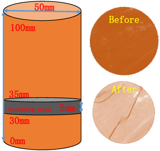 Before the coupled test for permeability, the samples were scanned using an industrial CT scanner. A random zone of 30 mm to 35 mm from the bottom was determined as the interesting area, and the scan interval was set at 0.1 mm, with a total of 51 layers, shown in Figure 2. After sample failure, the same zone of all 9 samples was scanned again for CT images of 1024 × 1024 pixels and 57 μm resolution.