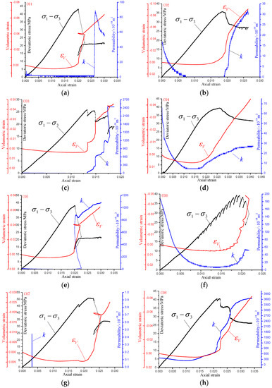 Figure 3 shows the coupled evolution of permeability with volumetric strain. The nine samples experienced the same behavior, including linear elastic compression, nonlinear compression with local damage, plastic deformation, and post-peak softening before failure. Accordingly, the volumetric strain underwent the two main stages, compression and dilatancy. There are two kinds of transition point: the first is the dilatant point, indicating the deformation transition from compression to dilatancy, and the second is the continuous-discontinuous point, indicating the phase from pore-based to fracture-based structure. The confining pressure promotes strain-softening behavior in the post-peak deformation. The higher the confining pressure, the more likely that volumetric strain will increase nonlinearly with stress.