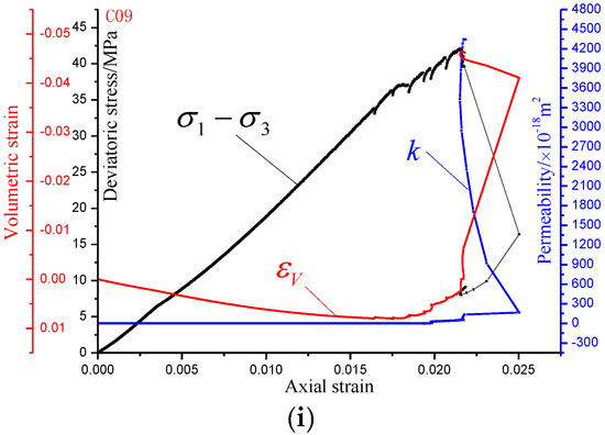 Evolution of volumetric strain and permeability on samples (a) C01, (b) C02, (c) C03, (d) C04, (e) C05, (f) C06, (g) C07, (h) C08, and (i) C09. Black lines indicate the stress–strain relationship, red lines indicate the volumetric–axial strain relationship, and blue lines indicate permeability with axial strain.