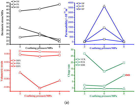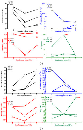 Deviatoric stress, volumetric strain, permeability, and permeability change rate at dilatant point, peak point, and residual point under confining pressures of (a) 3 MPa, (b) 6 MPa, and (c) 9 MPa ∞ indicates an infinite value because the denominator may be 0, represented by a larger value such as 10.