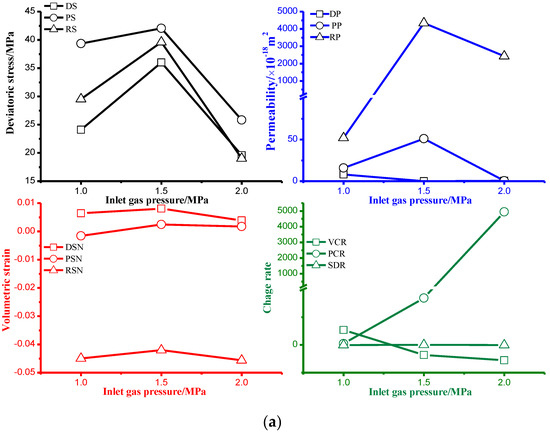 According to the principle of effective stress, the enclosed gas pressure can reduce the net value of external pressure on the coal matrix. Overall, with an increase in gas pressure, dilatant stress, peak stress, and residual stress all increase accordingly. With an increase in confining pressure, the enclosed space tends to be ideal and the three types of stress show a much more significant increase, as shown in Figure 5. In most cases, residual stress is greater than dilatant stress. After peak stress, the enclosed space is broken and the static pressure in the porous network does not play a determining role, while under dilatant stress, the sample is still in a nonlinear enclosed space and pore pressure does not effectively cause an increase. Such difference indicates that pore pressure plays a less significant role than confining pressure. For the applicable conditions of the principle of effective stress, there is an available-to-unusable transition corresponding to the enclosed space existing and breaking after failure.