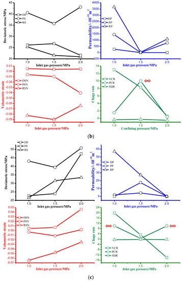 Deviatoric stress, volumetric strain, permeability, and permeability change rate at dilatant point, peak point, and residual point under confining pressures of (a) 1 MPa, (b) 1.5 MPa, and (c) 2 MPa. ∞ indicates an infinite value because the denominator may be 0, represented by a larger value such as 200 or 10,000.