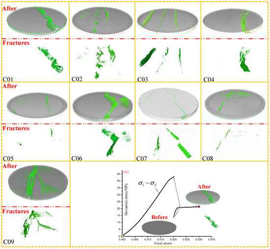 The CT topography of fractures for all nine samples is shown in Figure 6. After failure, the discontinuities can be divided into micropore network and macro-shear fractures. The complicated distribution of discontinuities shows the strong multiscale effect, and the multiscale connection forms a shearing block. Under triaxial compression, shear stress dominates the connected fracture generation and the shear in 3D space can occur in multiple fracture planes resulting in single network (C01 and C04), multiple network (C02 and C03), bending network (C06), crossed network (C07 and C08), pore-dominated network (C05), and complex network (C09).