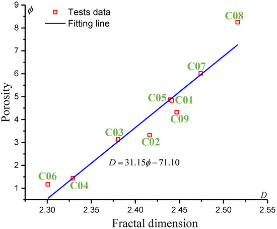 According to the volume-covering method, the relationship between fractal dimension and porosity (Table 2) of rough fractures after failure is obtained, shown in Figure 7. The relationship shows good linear characterization with fractal dimension and porosity, verifying that the fractal dimensions can be used to quantitatively characterize the complexity of the spatial distribution of rough fractures.