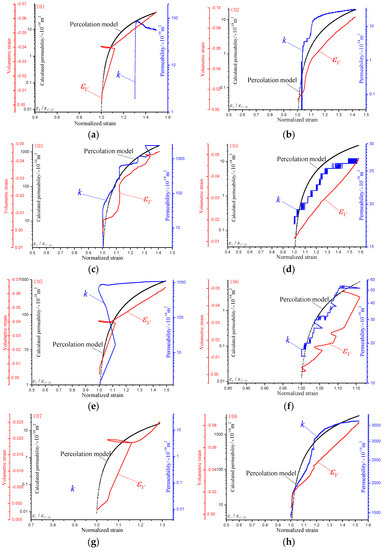 Using Equation (14), we compare the theoretical model with the experimental data for the permeability of all nine samples under triaxial compression. In Figure 8, the effective permeability of C07 is not obtained experimentally. The results for the remaining samples show acceptable matches, and even satisfying matches for C02, C03, C04, C06, and C08. Although confining pressure and gas pressure boundaries are different for each sample in Figure 4 and Figure 5, the percolation model for CH4 in coal shows excellent effectiveness.