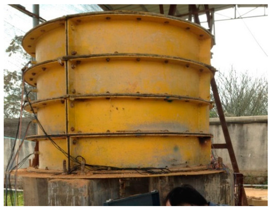 In order to expediently install, disassemble, observe, and sample, a simulation test frame was designed by stratified combination. It consisted of four rings with inner diameters of 1.5 m and heights of 30 cm, as shown in Figure 1. The material of the rings was high-strength steel, and they were connected to each other by high-strength bolts.