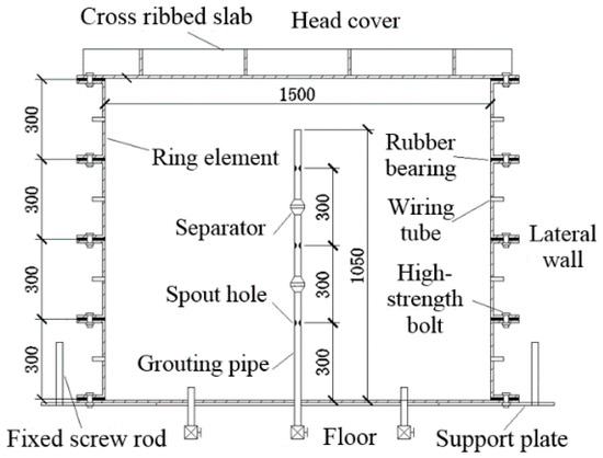 The grouting module included an internal preset device and an external grouting support system. As presented in Figure 2a, the internal preset device included grouting holes, a preset grouting pipe, and a pressure bearing separator. The diameter of the preset grouting pipe was 20 mm, and it was composed of a galvanized steel pipe with overflow holes arranged at intervals. The grout was injected into the ground layer through the overflow hole under the grouting pressure. As presented in Figure 2b, the pressure-bearing separator included a diffuser-bearing body and a waterproof sand bag. The waterproof sand bag was filled with sand to prevent the passage of the slurry during the grouting process.