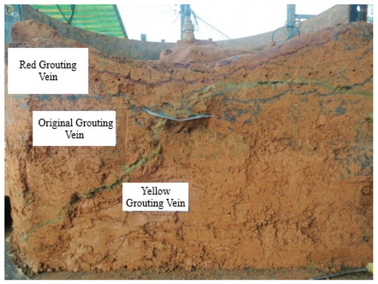 Considering the grouting hole as the origin, the skeleton vein extended outward along the direction of grout migration. Moreover, the thickness of the grouting vein was larger near the grouting hole. From the excavation results, it was found that the thickness of the grouting veins of each segmental grouting work was different along the grouting pipe. The thickness of the grouting veins was larger near the grouting hole, and the injected medium compressed by the grouting vein was denser. This indicated that the supporting role of the skeleton vein was more significant when the grouting vein was closer to the location of the grouting hole.