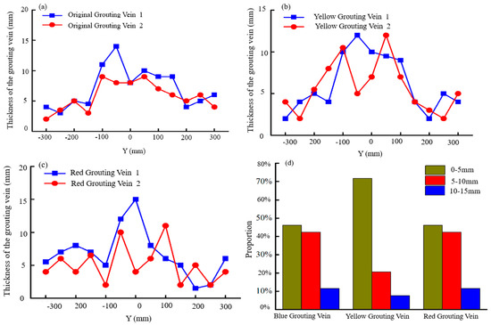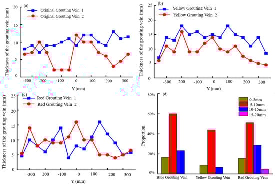 Figure 9 presents the thickness distribution of the grouting veins in the B (400 mm) section. Figure 9a–c present the thickness distribution of the original grouting vein, the yellow grouting vein, and the red grouting vein along the direction of grout migration, respectively. Figure 9d presents the thickness distribution proportions of the different grouting veins.