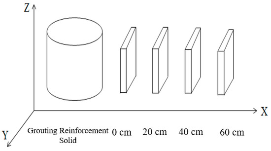 As shown in Figure 4, the excavation sections were perpendicular to the bottom plate of the simulated test frame, and they were excavated from the simulated test frame to the grouting hole. The line that crossed the grouting hole and that was perpendicular to the excavation section was taken as the x-axis. The intersection line between the excavation section and the floor of the simulated test rack was taken as the y-axis. In the excavation process, the section excavation method was adopted. The excavation step length was 200 mm, and the excavation plane was smooth. The position coordinates of the grouting veins and thickness variation of the grouting veins were recorded in detail.