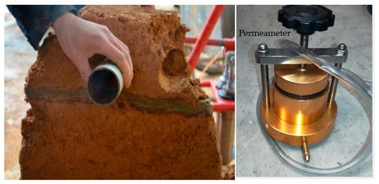 Figure 16 presents the specimen sampling of the grouting reinforcement solid area and the permeability test. The permeability coefficient of the sample was tested using a TST-55 permeameter, and the diameter and height of the sample were 61.8 mm and 40 mm, respectively. The sampling distance of each reinforced area was 30 cm.