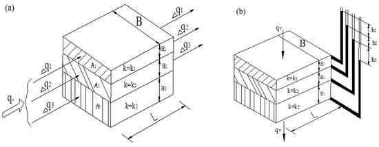Schematic diagram of stratified seepage: (a) parallel grouting vein direction and (b) vertical grouting vein direction.