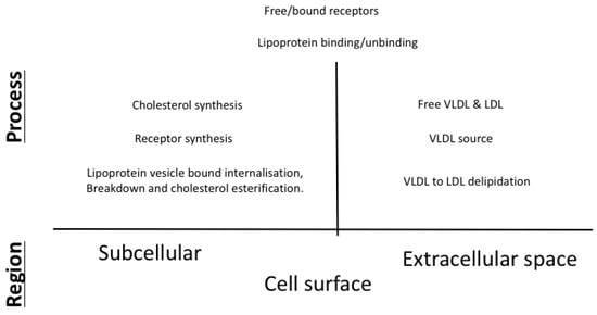 While the model described in this work extends previous descriptions of in vitro lipoprotein endocytosis, it has not been formulated with a specific in vitro cell experiment in mind, as was the case in [15]. Instead it seeks to describe relevant processes at the subcellular and extracellular scale, which can be found both in vitro and in vivo, thus providing a means of extrapolating between the two. We assume concentrations of VLDL and LDL are fed to hepatocytes in a controlled manner, thereby describing the basic mechanisms of cholesterol synthesis and LDL and VLDL metabolism without the added complexity of describing other dietary lipoprotein metabolism.