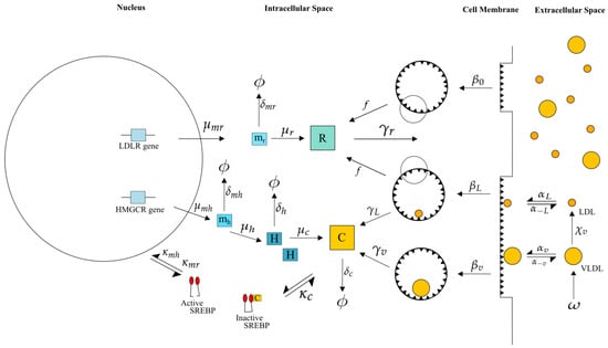 Applying the Law of Mass Action to those mechanisms described in Section 1.1 coupled with the models of [10,15] leads to the system of Equations (3)–(20), that integrate cholesterol and receptor biosynthesis with lipoprotein metabolism metabolism.