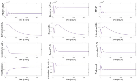 Numerical simulation of Equations (36)–(48). Initially mRNA levels increase in response to zero cholesterol in the system, which leads to an increase in HMGCR and internal receptor levels. VLDL and LDL bind to receptors and are internalised where cholesterol is extracted. The increase in HMGCR and extraction of cholesterol from internalised lipoproteins cause intracellular cholesterol concentrations to increase. Damped oscillations can be seen as HMGCR mRNA responds to changing cholesterol concentrations and the receptor mechanism responds accordingly. Following this initial transient behaviour, the molecular and cholesterol parts of the system settle to a relatively stable steady-state whilst VLDL and LDL continues to be extracted from the extracellular environment until a final steady-state is reached.