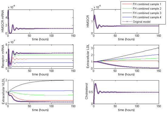 In this section we investigate whether our model is able to reproduce the known effects of the disease Familial Hypercholesterolaemia (FH), the aetiology of which is well known. By altering specific model parameters we can quantitatively represent the effect of genetic mutations on extracellular VLDL and LDL levels.
