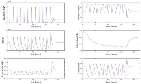 A simulation showing the effect of statin therapy on our integrated model of cholesterol metabolism. Here 11 doses are applied over a seven day period starting at approximately 10 h.