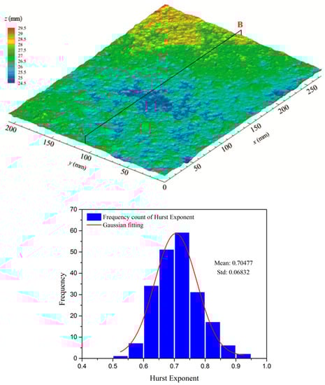 where indicates the magnitude of the roughness or the so-called Hurst exponent varying from 0 to 1 and is a scaling factor. can be thought of as a function of an independent spatial or temporal variable . For a self-affine fracture wall, the stationary increment [] over the distance follows a Gaussian distribution with mean zero. Thus, for the arbitrary, the mean and variance of the increments can be expressed as: