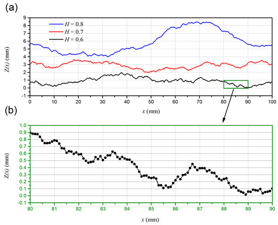Self-affine fracture walls with the different Hurst exponents. (a) The self-affine fracture walls with H = 0.6, H = 0.7, and H = 0.8, respectively. (b) The zoom-in self-affine fracture wall with H = 0.6 between x = 80 mm and x = 90 mm.