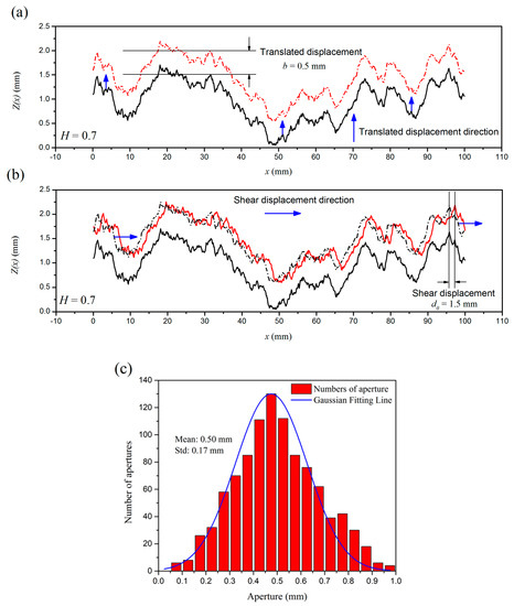 In self-affine fractures, the aperture distribution can have a significant influence on the spreading and mixing processes. The reconstruction of the aperture field from a pair of generated fracture walls is dependent upon the way in which the walls are oriented relative to each other. Note that the Hurst exponent could be different for the top and bottom fracture walls. However, our aim here is not to perform an exhaustive investigation for all possibilities. It is assumed that the reconstructed fracture is two-dimensional, uniform mineral component, there is no contact area (no zero-aperture region), and the Hurst exponent for both of the top and bottom fracture walls is the same. Two possibilities to reconstruct the rough fracture aperture field from the specific self-affine fracture walls were considered. First, a constant-aperture rough fracture was introduced, where the top fracture wall was a replica of the bottom fracture wall translated a distance normal to the mean plane (See Figure 3a). In this case, the fracture walls are rough and self-affine, but the local aperture is constant and equal to. Alternatively, the variable-aperture rough fracture was studied, where the top fracture wall was a replica of the bottom wall. The bottom wall was sheared along the horizontal direction by a displacement and then translated a distance normal to the mean plane (See Figure 3b). Obviously, the two walls of the reconstructed fracture with shear displacement do not overlap and the local aperture is a function of the horizontal location x. Based on the self-affine scaling law, Wang, et al. [44] developed the shear displacement model to obtain the aperture field with Gaussian distribution. The local aperture is given by: