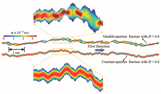 The flow fields in variable-aperture and constant-aperture fractures with H = 0.6 for Pe = 1000.