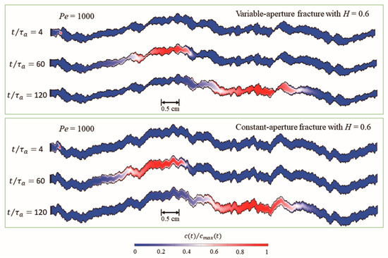 The solute transport in variable-aperture and constant-aperture fractures with H = 0.6 for Pe = 1000.