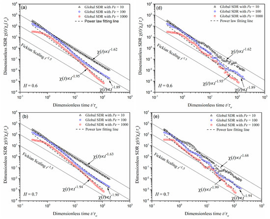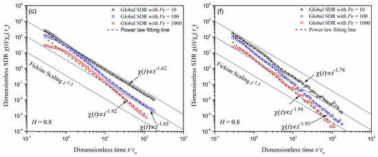 Each SDR in Figure 6 was fitted with a power-law function of the dimensionless time over the entire temporal range (). For both constant-aperture and variable-aperture fractures, the SDR scaling for a given Peclet number is generally independent of the Hurst exponent of the fracture wall, while the Peclet number has a significant influence on the SDR scaling. When the Hurst exponent ranges from H = 0.6 to H = 0.8 the exponents in the power law fit are very similar for a particular Peclet number value in both constant-aperture and variable-aperture fractures. For one-dimensional fractures, the analytical SDR scaling follows the Fickian scaling , as shown in Equation (22). Thus, as per the definition by Le Borgne et al. [31], the results in Figure 6 indicate that the SDR scaling is non-Fickian and the exponent of the best-fit power law equation for the SDR increases as the Peclet number decreases. This indicates that predicting the temporal evolution of the SDR over the entire temporal range in both constant-aperture and variable-aperture fractures using the one-dimensional analytical SDR scaling is inappropriate as this underpredicts the SDR, especially for the cases with the high Peclet number. Furthermore, it can be seen from Figure 6a–c that in constant-aperture fractures, for a given Peclet number, the results are similar for H = 0.6, H = 0.7, and H = 0.8. This implies that the roughness of the self-affine fracture walls, as characterized by Hurst exponent, is not a dominant influence on the temporal evolution of the SDR in the constant-aperture fractures. In contrast, as shown in Figure 6d–f, for a given Peclet number, the exponent of the best-fitting power law decreases as the Hurst exponent increases and spatial correlation increases.