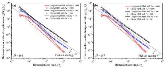 The validity of predicting the global SDR by the longitudinal SDR can be evaluated by comparing the longitudinal SDR to the global SDR. The longitudinal SDR can also be considered as the contribution of the transverse concentration gradients to the global SDR. For the cases in the constant-aperture fractures, Figure 7 shows the global SDR estimated from the full concentration field and the longitudinal SDR estimated from Equation (23). In general, regardless of the influence of the Hurst exponent and Peclet number, the temporal evolution of the longitudinal and global SDR both decrease as power-law functions of time. For the cases with Pe = 10, the longitudinal SDR is very close to the global SDR, which indicates that the longitudinal SDR is capable of predicting the global SDR in the constant-aperture fractures. This also reveals that the transverse concentration gradients, in this case, do not play a dominant role in global mixing. Thus, both of the longitudinal and global SDR follow Fickian scaling ().