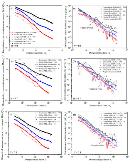To predict the global SDR from the longitudinal SDR, it is essential that the temporal evolution of the longitudinal SDR has the same tendency as the global SDR, which implies that the longitudinal concentration second moment should decrease as a power-law function of time. This would be true for the cases in the constant-aperture fracture, however, it is not necessary in the variable-aperture fractures where the abruptly changing aperture leads to the convergence of streamlines. The temporal evolutions of both the longitudinal and global concentration second moments in the variable-aperture fractures were investigated. The longitudinal and global concentration second moments is associated with the temporal evolutions of longitudinal and global SDR, respectively, as shown in Figure 8. Unlike the temporal evolution of the global concentration second moment, the temporal evolution of the longitudinal concentration second moment does not follow a strictly monotonic decrease with time for all conditions considered. Consequently, the longitudinal SDR in the variable-aperture fractures has a negative value (corresponding to the discontinuities in the lines in Figure 8b,d,f) though this is not possible as per the definition of Equation (16). This negative longitudinal SDR results from the fact that the longitudinal concentration second moment increases when the plume is transported in the small-aperture regions. For conservative solute transport, the mixing is an irreversible process and associates with the entropy of the mixing system towards its maximum. Although the longitudinal SDR generally decrease as a power-law function of time in the variable-aperture fractures, the negative value in SDR is physically meaningless. Therefore, predicting the global SDR by the longitudinal SDR is inappropriate in the variable-aperture fractures.