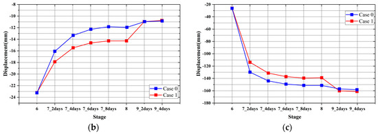 | Stage 9 | Steady state | Hydraulic–mechanical coupling | The coupled, drained simulation is executed until the steady-state condition was reached for each case (4 days) 2. |
