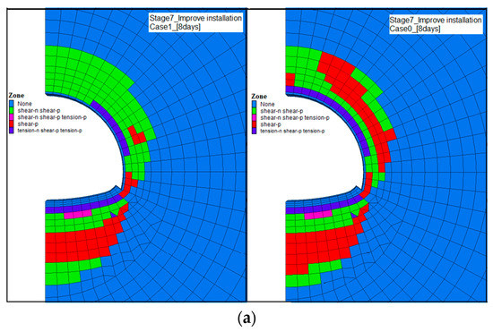 Obviously, if the groundwater is permitted to continue to flow into the tunnel, larger failure is expected to occur. Therefore, it was decided to take measures to stop the drainage of groundwater through the tunnel walls to prevent the tunnel from greater damage. The distribution of failure zones in the two different cases are shown in Figure 8. The same simulation time is set in the two cases after improving part installation. In stage 9, the simulation time is four days in the two cases. In two stages, there are more distinct failures in Case 0 than that in Case 1. It illustrates water-reducing measures play an important role in the stability of tunnel support. During the drainage process, the evolution of tension failure of the tunnel surrounding rock in Case 1 is slower than that in Case 0.