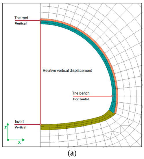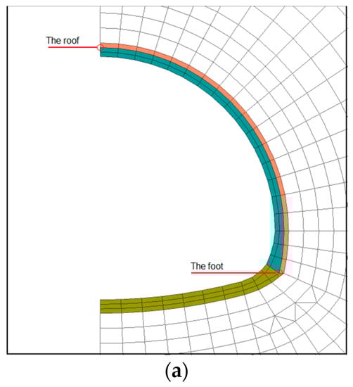 As a primary support of tunnel surface, concrete lining serves a number of functions, such as supporting adjacent ground and resisting ground erosion and degradation. The minor principal stress of the reinforced concrete lining in the roof part and the foot part are presented in Figure 14b,c, respectively. The minor principal stress is reduced in the lining structure after the improving part installation. The pore pressure in the permeable shotcrete layer is maintained at zero around the liners before the lining is applied. The pore pressure in the impermeable lining structure attempts to reach linear hydrostatic values.