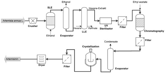 In addition to the shown benchmark pathway much effort was put into new, or rather enhanced, methods for the isolation of artemisinin. Lapkin et al. screened for various solvents to increase the efficiency of the solid-liquid extraction step. They applied the COSMO-RS model (short for COnductor like Screening MOdel for Real Solvents) to find potential candidates and performed an experimental validation. The screening included even non-conventional solvents in terms of solid-liquid extraction, such as fluoroform [18]. Due to the complex molecular structure of artemisinin and the characteristics of the plant material optimization of extraction is always a multi-parameter approach. In addition to physico-chemical consistent methods, design of experiments offers the possibility to search for possible points of operation and investigate the influencing parameters of the process. De O. Silva et al. showed such an approach using the Box-Behnken experimental design. As expected, the drug-solvent ratio influenced the batch extraction the most [19]. In addition to extraction and purification of artemisinin, synthesis was investigated. One promising approach is a photo-chemical continuously operated process to transform dihydroartemisinic acid into artemisinin, by Seeberger and coworkers [20,21]. The precursor dihydroartemisinic acid is extracted from annual mugwort but is found in larger quantities compared to artemisinin. Not only extraction and synthesis have been investigated; whole processes and value chains single unit operations in the downstream of artemisinin have been assessed [22]. Suberu et al. identified co-metabolites in the plant extract that negatively affect the crystallization of artemisinin [23]. This investigation is very important to identify those compounds that must be removed by unit operations before crystallization. Especially costly unit operations, such as chromatography, benefit from that investigation because not all substances have to be separated, but the right ones.