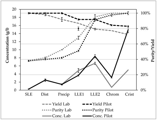 For the basic operations of the selected lab study with complex feed, the small error bars, as seen in Figure 4, are striking. Thus, the method to select individual process steps based on the characterization of real feed mixture can be considered robust and reproducible. In general, however, the laboratory study shows a higher loss due to a mostly one-step mode of operation and smaller quantities. The laboratory process has a yield of 72%, the pilot process of 83% and is, thus, 15% higher. The patent-based reference process has a 59% yield. The two newly developed processes are significantly above this value (+40% pilot, +22% laboratory). According to literature, the yields of common methods are between 45% and 80% [24].