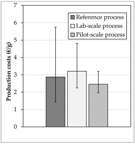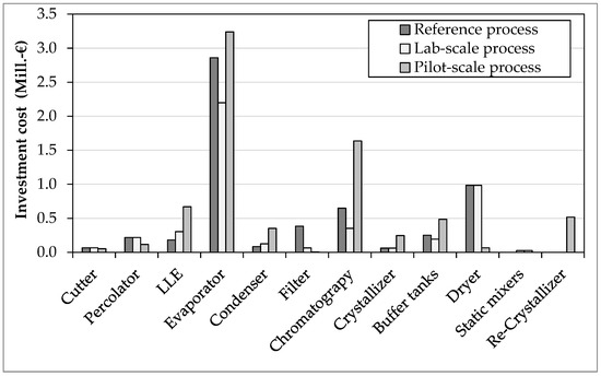 - Equipment costs for crystallization are also about 300% more expensive in the pilot process than in the laboratory or reference study. The acetone/isopropanol (VWR®, Darmstadt, Germany) system theoretically considered in the laboratory study has a steeper solubility curve than the ethanol/water system used in the piloting. As a result, significantly more crystallization steps must be carried out successively in the pilot process, which consequently also results in higher apparatus costs.