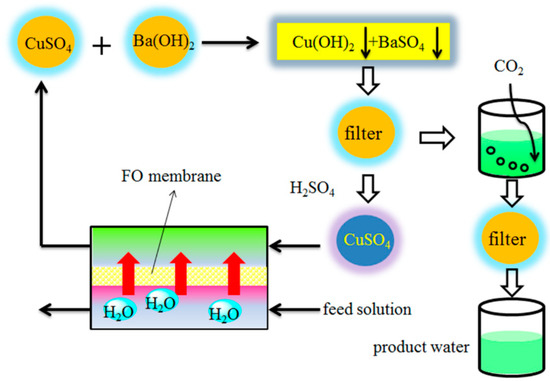 Schematic illustration of the use of precipitate method to regenerate CuSO4 draw solution (DS) after forward osmosis (FO) process.