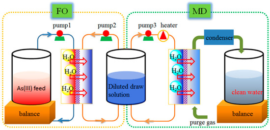 Schematic illustration of using a hybrid FO-MD process for wastewater treatment.