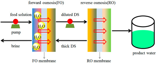 Considering the low molecular weight cut-offs and high solute rejection, RO is a good option for DS recovery when using monovalent salts (e.g., NaCl, seawater) as DS [136]. In the past few years, most of inorganic salts, including NaCl (seawater), MgCl2, MgSO4 and Na2SO4, were frequently used as DS, due to their high osmotic pressure. However, these diluted monovalent salts solution after FO often require extremely high energy costs to be regenerated. It seems impossible to use RO for DS recovery. In spite of this, the hybrid FO-RO for seawater desalination was also proposed (Figure 3) [33], FO and RO can be used as the front end pretreat and post-treatment desalination technologies, respectively [136]. The advantages of this system are greatly reducing membrane fouling after FO treatment [137] and the energy cost in RO units, because of seawater diluted after FO [137].
