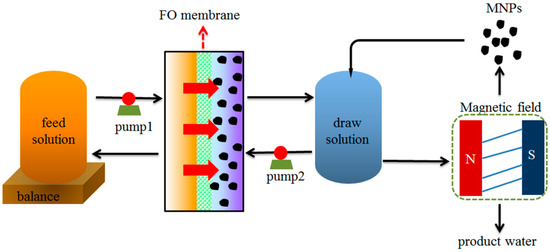 Schematic illustration of using functionalized magnetic nanoparticles as DSs in FO process. (MNPs, magnetic nanoparticles).