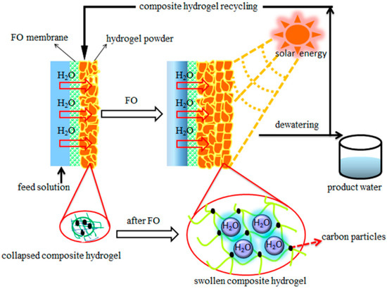 Smart materials may undergo a reversibly change between water absorption and dehydration with the change of surrounding stimuli (e.g., sunlight, pressure, heat). Recently, a series of stimuli-response hydrogels were proposed as DS in FO. This novel type of hydrogels-driven FO process (Figure 5) employing the solar energy for the DS regeneration have been attracting more and more attentions. Especially, the light or thermoresponse hydrogels can release fresh water when it is exposed to sunlight, because of the structure’s own shrinkage. For instance, the light or thermoresponse hydrogels can take up enough water under the temperature of maximum volume phase transition and dewater at temperatures above the volume phase transition temperature [34,49,142,143,144,145]. The graphene-doped hydrogels as DS were proposed by Li et al. [109]. The efficiency of water release was significantly improved; because of the heat absorption was enhanced by adding an appropriate amount of graphene. In addition, the hydrogels doped with light-absorbing carbon particles (10~25 μm) was also reported [112]. Under the irradiation intensity of 1.0 kW/m2 for 20 min, a water recovery rate of 50% was achieved, which is superior to than that of p(NIPAM-co-SA) hydrogels (around 17%). However, the doping of the carbon materials, if beyond a certain scope, may scarify water fluxes, for the direct contact area reduced between hydrogels particles and FO membrane. Similarly, other hydrogels, such as dual-functional polymer gels and photosensitive particles [108] and photosensitive particles [37] all show the same effects of taking up and releasing. The eco-friendly dewatering process by using solar energy may obviously reduce the cost. However, the collection of clean water released by the exposure of thermoresponse hydrogels under sunlight remains a big challenge now [146].