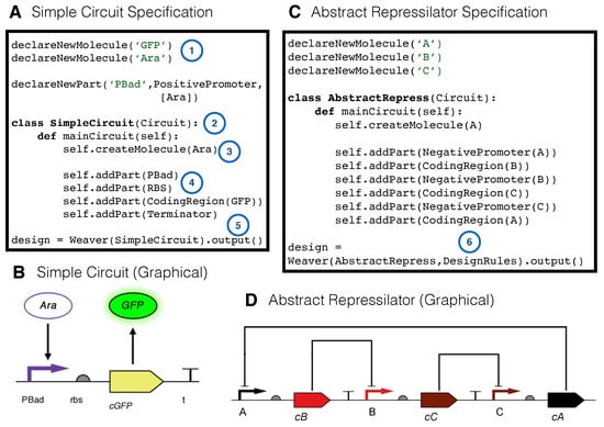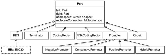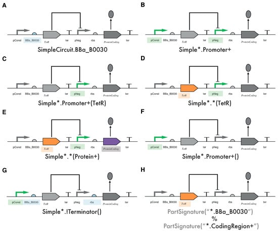 - Bilitchenko, L.; Liu, A.; Cheung, S.; Weeding, E.; Xia, B.; Leguia, M.; Anderson, J.C.; Densmore, D. Eugene—A domain specific language for specifying and constraining synthetic biological parts, devices, and systems. PLoS ONE 2011, 6, e18882. [Google Scholar] [CrossRef] [PubMed]